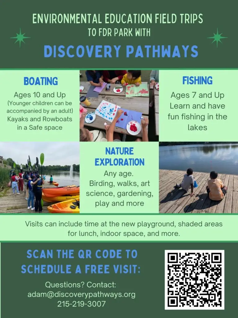 Discovery Pathways provides free, hands-on environmental education for K–12 students through school field trips and recreation center programs across Philadelphia. Programs are aligned with school curriculum and state standards, and combine nature exploration, watershed science, teamwork, and healthy outdoor movement.